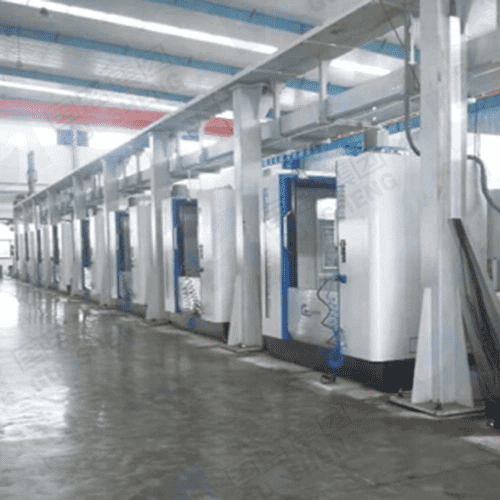 由桁架机器人将多台卧式加工中心组成自动化生产线,替代传统的滚道线,将操作工从十多人降低至一人,降低用人成本。